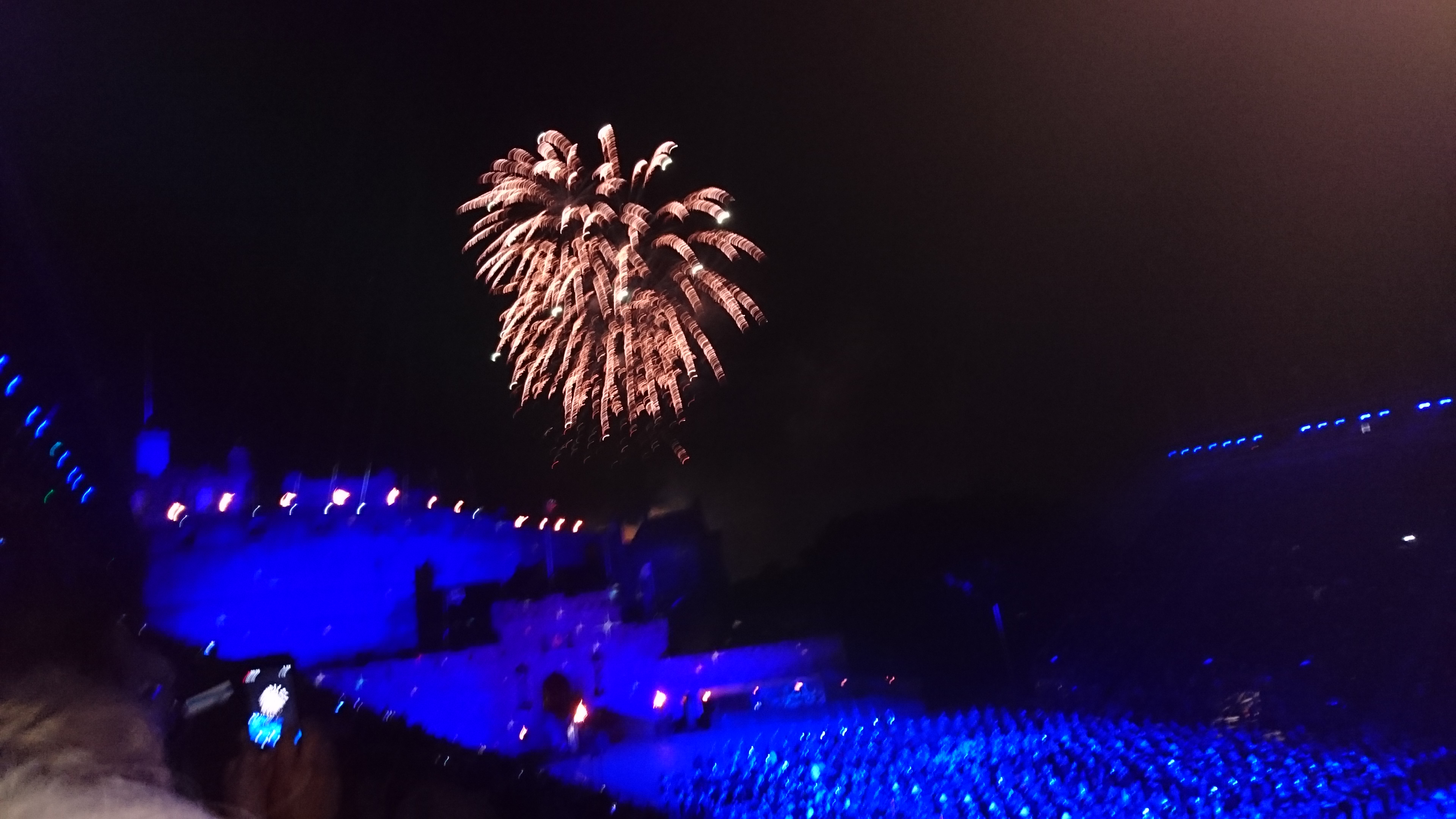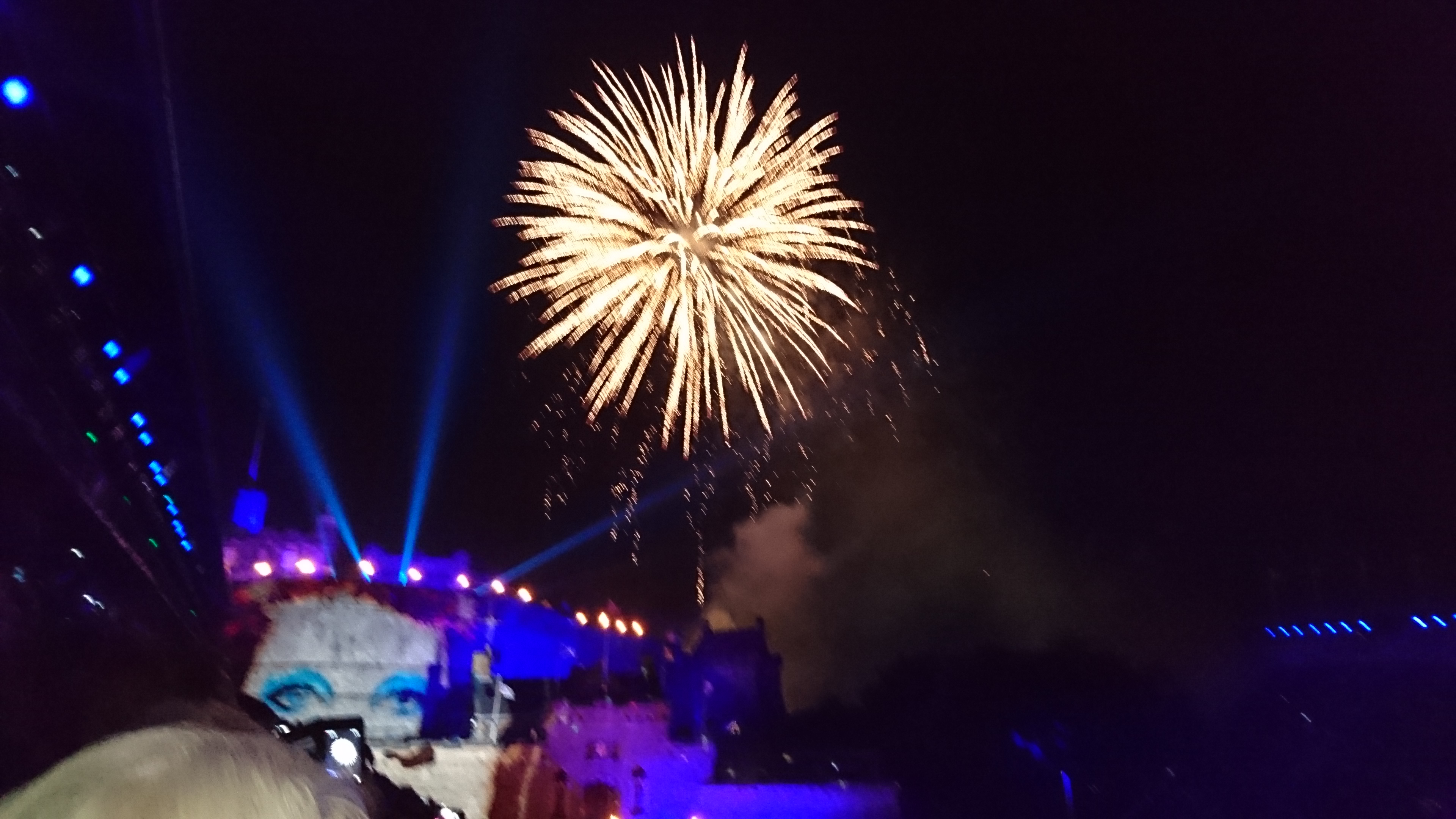 Se arma una tribuna con forma de U, en el predio frente al castillo, por lo que el mismo pasa a ser el telón de fondo de uno de los espectáculos más soberbios que hoy por hoy se pueden ver. Cabe aclarar que no se suspende por mal tiempo, por suerte nos tocó una noche genial considerando esa latitud, había viento pero no lo sentíamos desde nuestra ubicación.