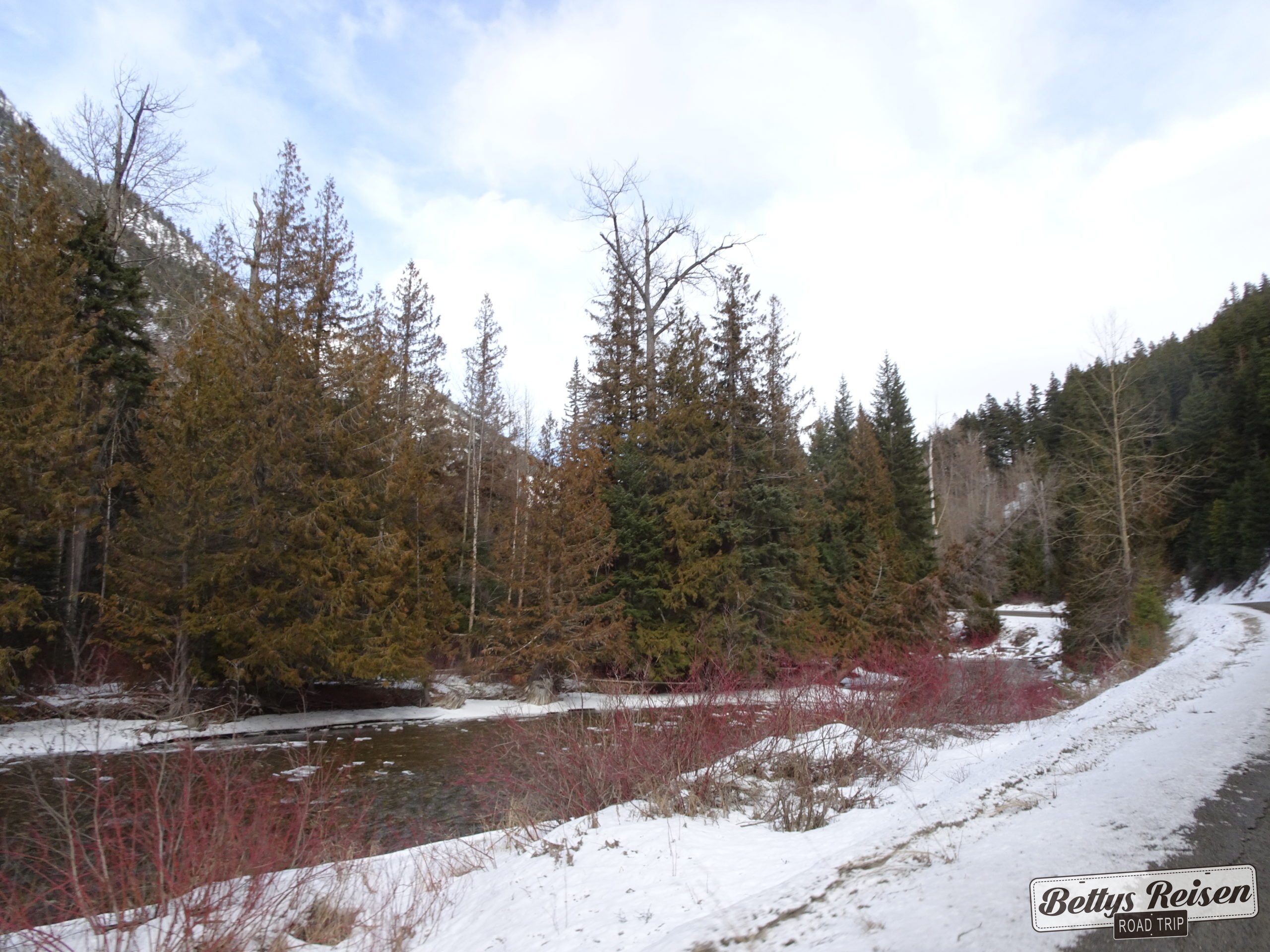 Los primeros kms de este día fueron los más aburridos del viaje, porque no había ni vegetación, el frío había dejado ese color marrón insípido, los árboles sin hojas y la nieve estaba ausente.