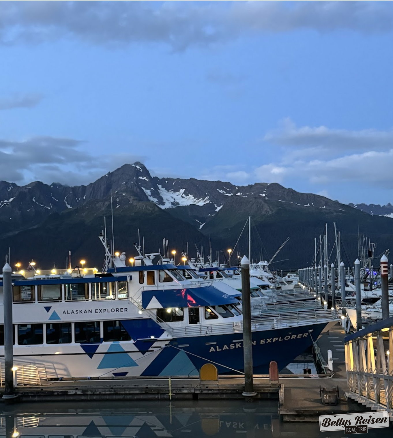 Llegamos a la hermosa Seward. un vibrante pueblo costero en la península de Kenai, rodeado de montañas escarpadas y las aguas turquesas de la Resurrection Bay.